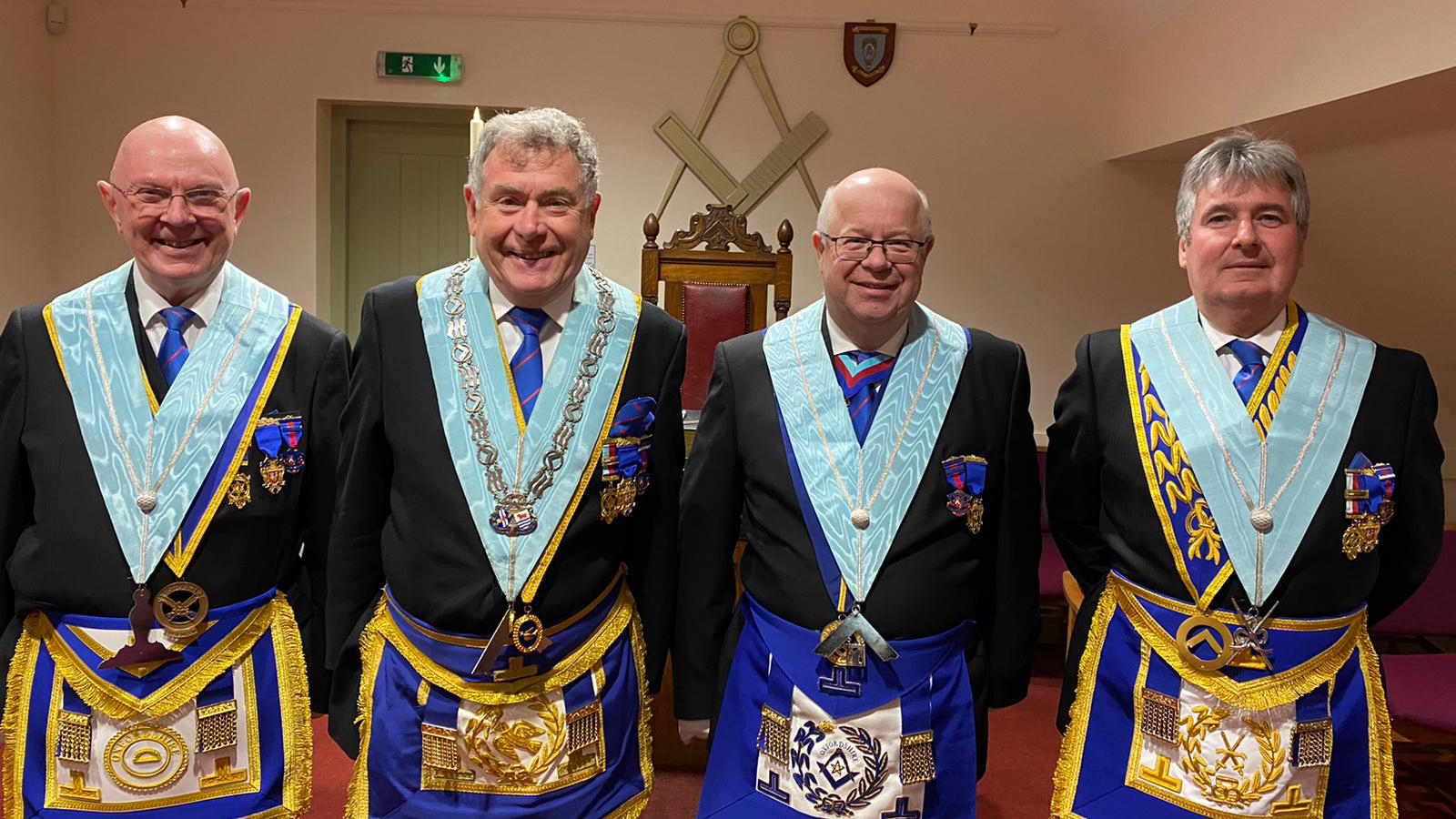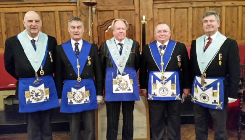 ![]() The Dorset Masters Lodge Worshipful Master V.W. Bro. C.W. Deakin PDPGM, flanked either end by his Senior and Junior Wardens, plus other visitors standing. |