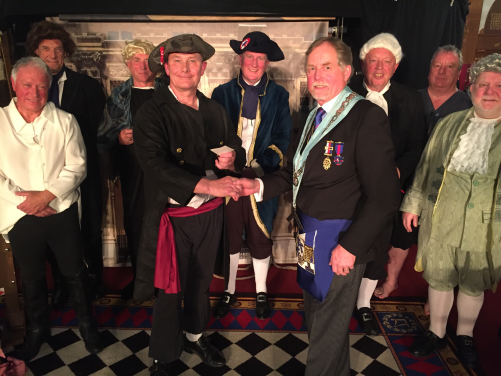 Visiting is like a box of chocolates; you never know who you’ll meet! (Apologies for the jumbled plagiarism). At the invitation of V.W. Bro. C.W. Deakin PDPGM and Worshipful Master of Dorset Masters Lodge No. 3366, W.Bro. Roy Simmonds and W.Bro. Brian Fairweather attended as Master and Senior Warden of the Oxfordshire Lodge of Installed Masters No. 7770 and, along with 80 other Masters visitors and guests, were royally treated to a very interesting meeting and lecture on the 'Universities Scheme'. The meeting held under the banner of Verwood Lodge No. 9177 took place at the Wimborne Masonic Hall on Thursday 3rd March 2016. Amongst the many interesting aspects of the Temple was the display of eight wall plaques depicting the traditional history. W.Bro. Fairweather mentioned during the meeting that his mother Lodge, Old Rectory No. 6651, meeting at Caversham Masonic Centre, benefitted from a full set of ten of the same wall plaques, this caused considerable after dinner questioning and exchanging of website details, by several historically inclined brethren. Visiting, as stated earlier, is just like the proverbial box of chocolates as, still unaware of the surprise awaiting them, the visiting Oxfordshire Masons were surprised by none other than that well known Oxfordshire Brother and member of Oxfordshire Installed Masters, W.Bro. Steven Quant, disguised as W.M. of Brownsea Island Lodge No. 9698. Visiting truly is like a box of chocolates. And such fun! |